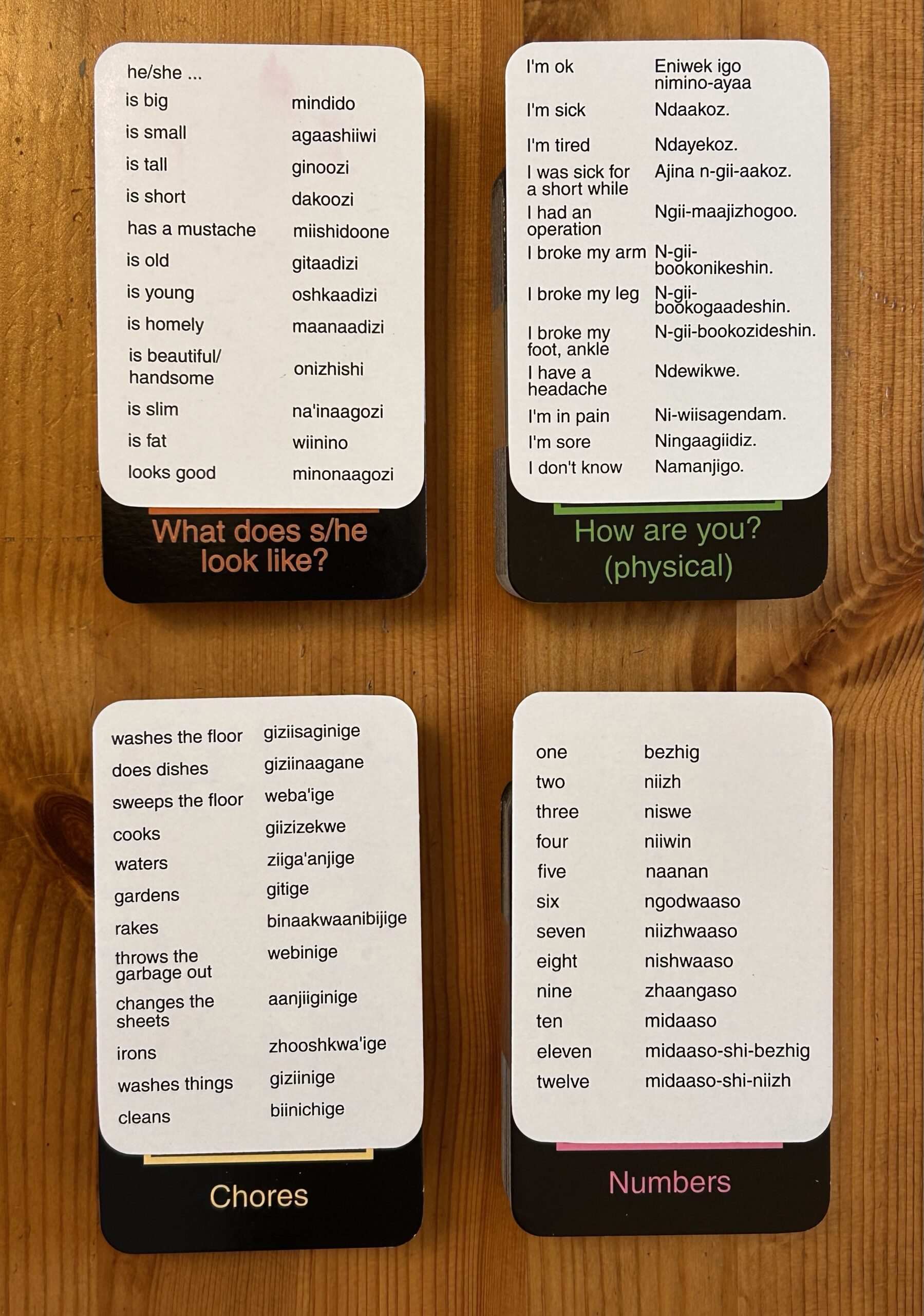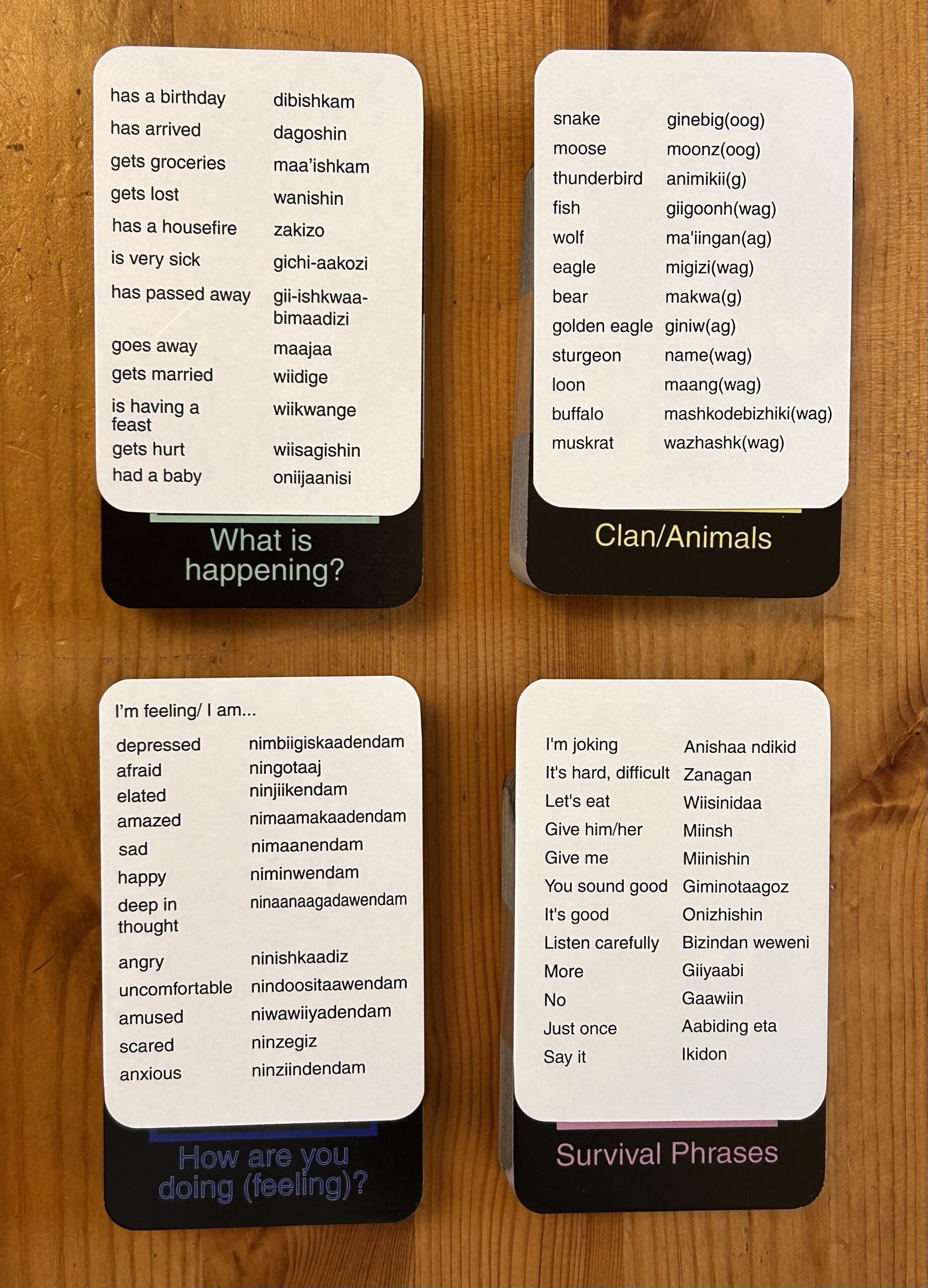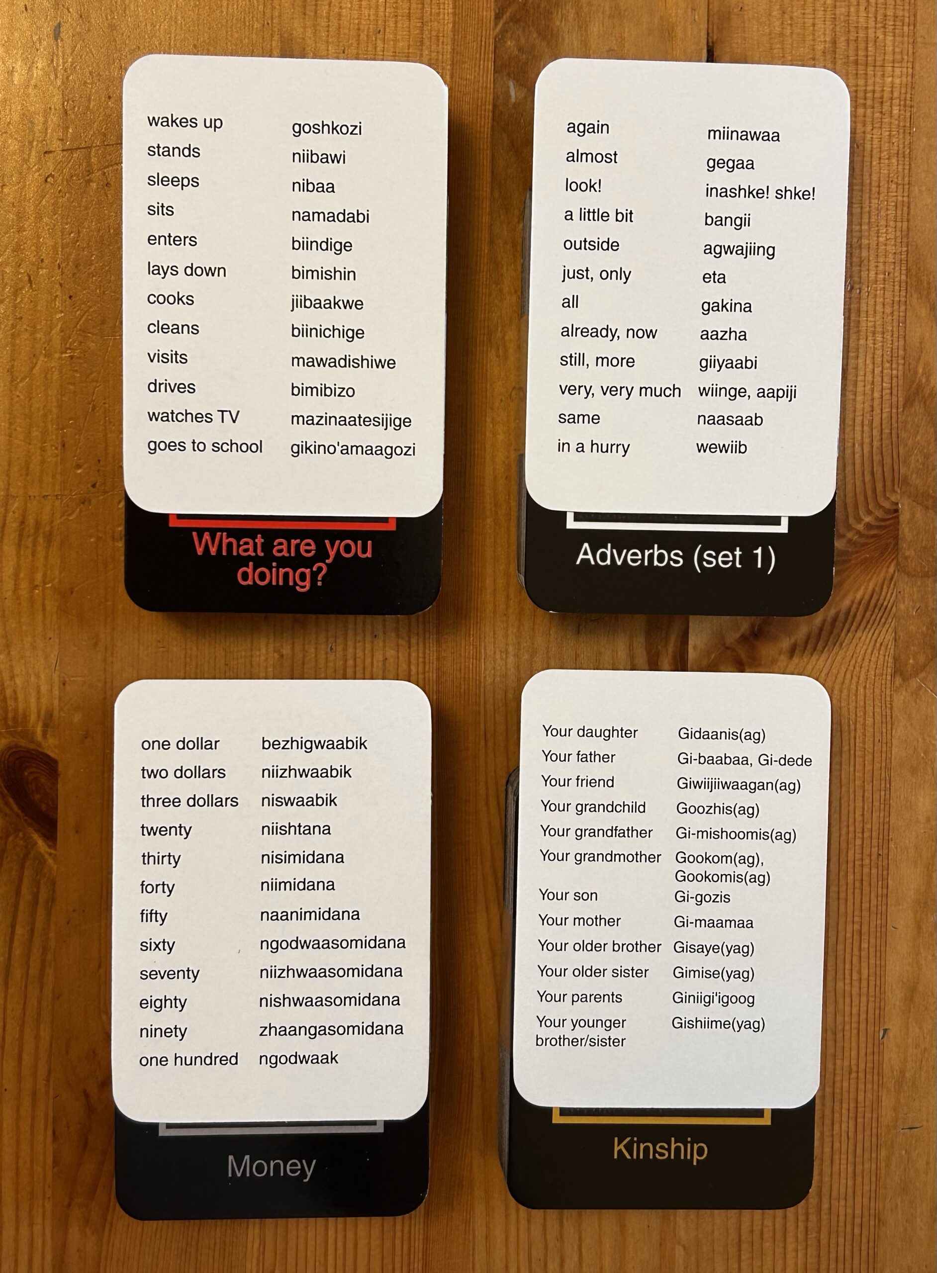 Go Fish cards is a language resource for learning phrases. Each deck is based on a different theme with 12 phrases or words in each deck. Each deck includes 52 cards- 4 of each phrase in English plus 4 blank cards and 2 cards listing the 12 phrases in Anishinaabemowin and English. Can be modified for any language by creating your own translation card. See photos for full list of words and phrases in each deck.