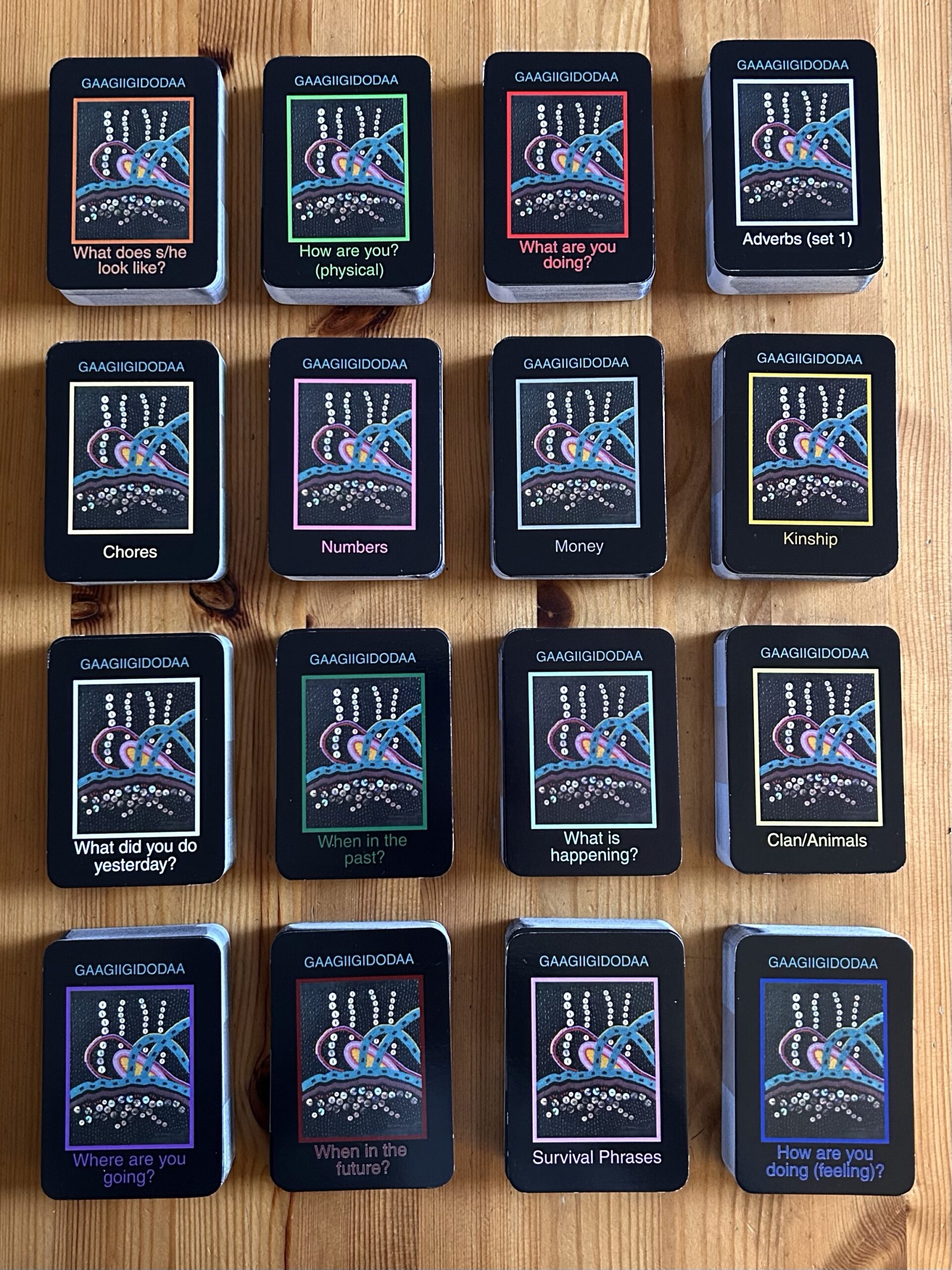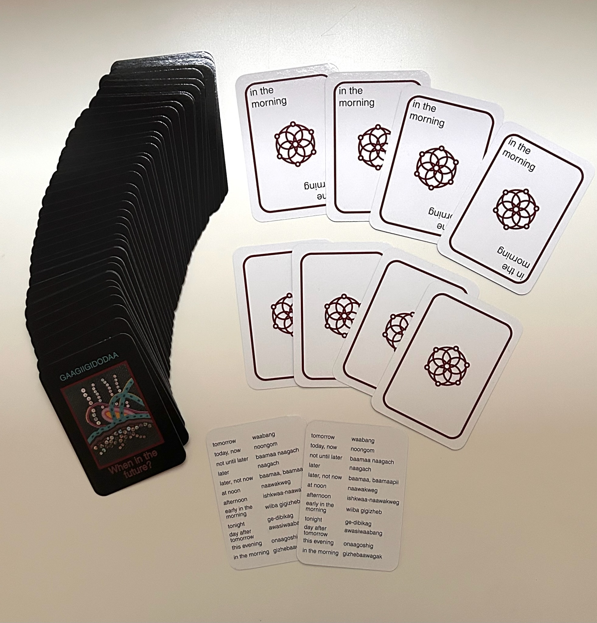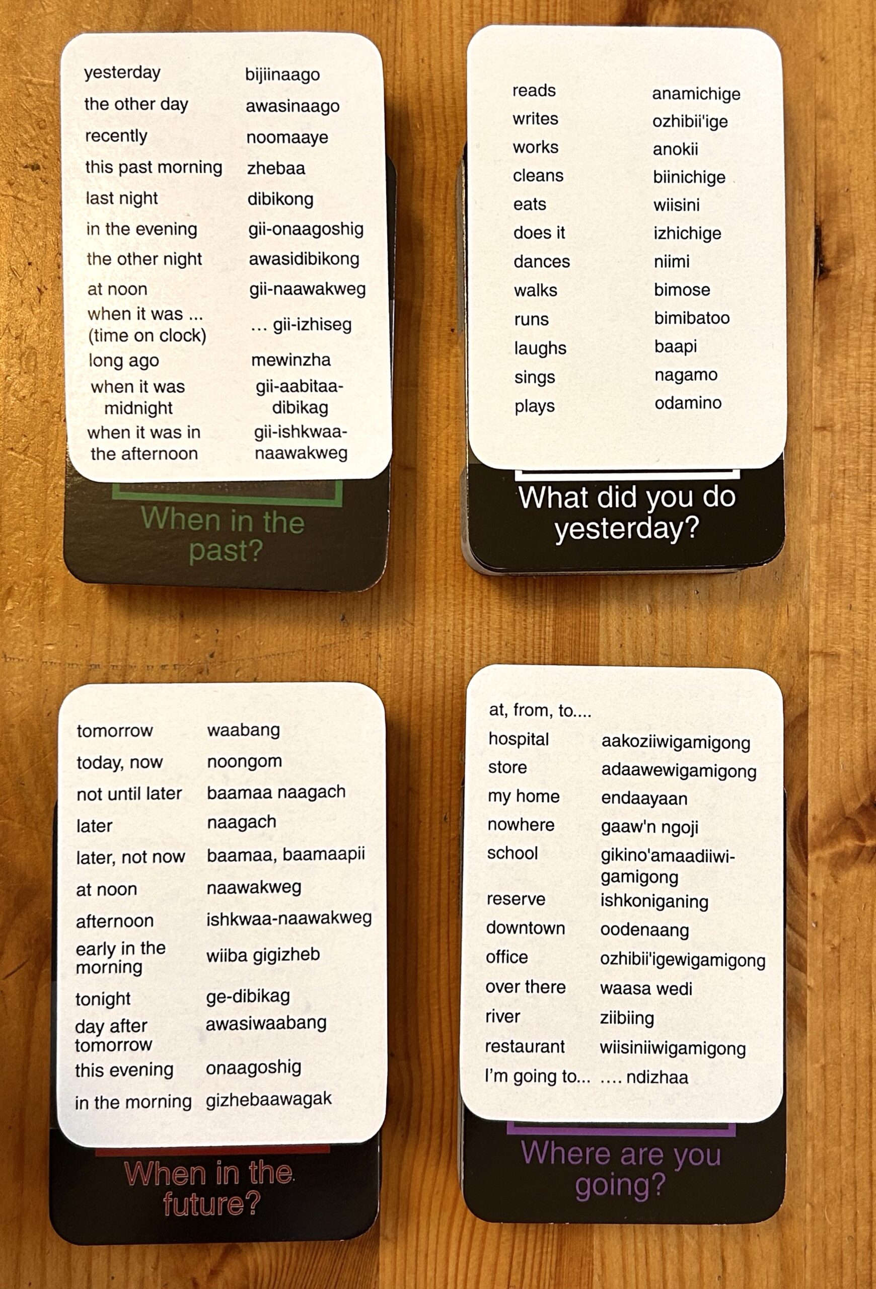 Go Fish cards is a language resource for learning phrases. Each deck is based on a different theme with 12 phrases or words in each deck. Each deck includes 52 cards- 4 of each phrase in English plus 4 blank cards and 2 cards listing the 12 phrases in Anishinaabemowin and English. Can be modified for any language by creating your own translation card. See photos for full list of words and phrases in each deck.